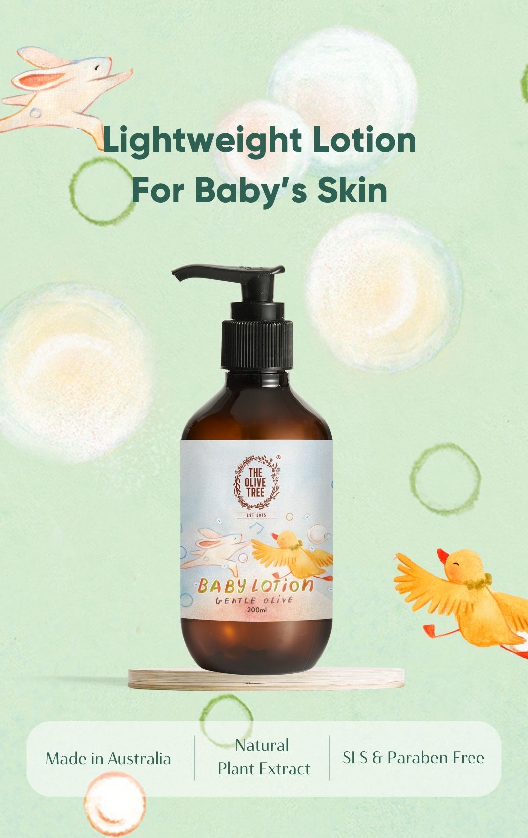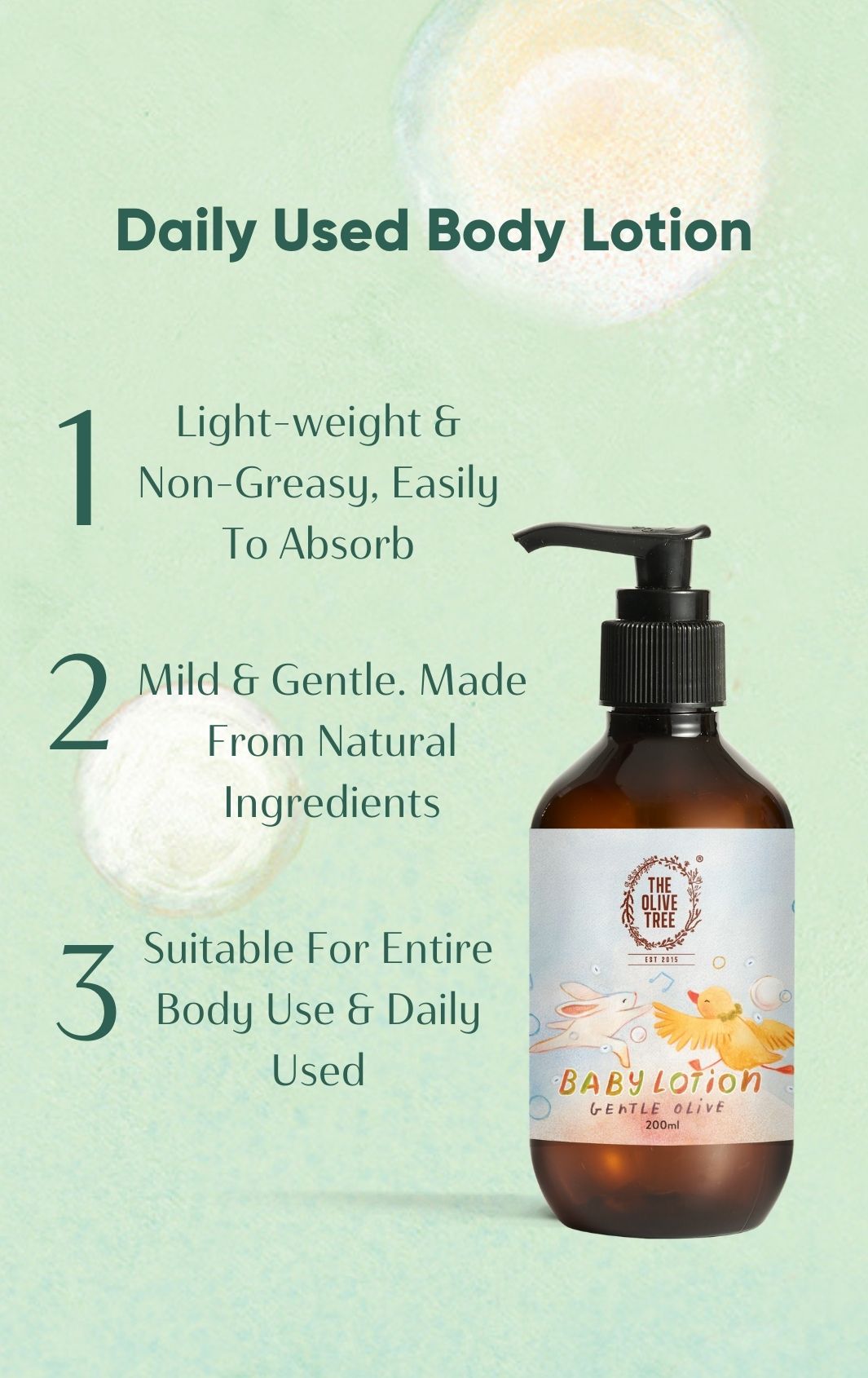 A lovingly crafted Gentle Olive Baby Lotion, especially formulated for your little one's delicate skin.